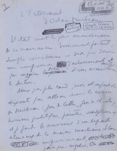 On interroge Sacha Guitry sur « …l’écrivain qu’il a le plus aimé… » sa réponse, sans hésitation « Octave Mirbeau… Je l’ai aimé pour son œuvre, pour son intelligence et pour son cœur… ». Le second manuscrit est un premier jet ou un manuscrit de travail, il comporte de nombreuses corrections, ratures, ajouts, un petit dessin en bas du coin gauche de la page 3. On notera aussi des indications techniques « 5h kodak 16m.m. ».
