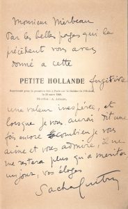• OCTAVE MIRBEAU sur le faux-titre : Monsieur Mirbeau Par les belles pages qui la précèdent vous avez donné à cette [Petite Hollande] fugitive une valeur inespérée, et lorsque je vous aurai dit une fois encore combien je vous aime et vous admire, il ne me restera plus qu’à mériter, un jour, vos éloges Sacha Guitry