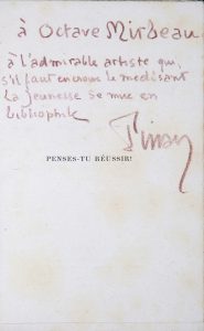 • OCTAVE MIRBEAU : À Octave Mirbeau à l’admirable artiste qui, s’il faut en croire le médisant La Jeunesse se mue en bibliophile Tinan