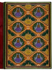 intérieur d’un listel brun serti de deux filets dorés, doublure de maroquin fauve orné d’un décor à répétition de fleurs de tournesol et de chardon mosaïquées disposées dans un pavage de losanges, gardes de moire rouge tomette, doubles gardes de papier marbré, tranches dorées sur témoins, double couverture et dos (Ch. Meunier 1901).