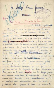 On notera également les nombreuses corrections, ajouts, ratures, utilisation de plusieurs encres (bleue, noire, rouge) qui nous permettent de pénétrer un peu plus dans la pensée de l’auteur.