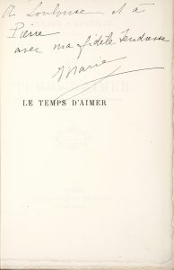 HOUVILLE (Gérard d’). Le Temps d’aimer. Paris, Calmann-Lévy, s.d. [1908]. In-12, demi-maroquin bordeaux avec coins, dos à nerfs portant le titre doré, tête dorée, non rogné, couverture et dos (Canape).
