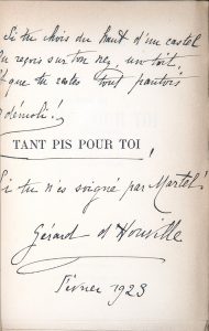 HOUVILLE (Gérard d’). Tant pis pour toi. Paris, Arthème Fayard & Cie, 1921. In-12, demi-basane bordeaux avec coins, dos à nerfs portant le titre doré, tète dorée, non rogné, couverture (Reliure de l’époque).