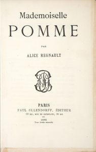 REGNAULT (Alice). Mademoiselle Pomme. Paris, Paul Ollendorff, 1886. In-12, demi-maroquin bordeaux à gros grain, filet doré, dos orné, tête dorée, non rogné, premier plat de la couverture (R. Vincent).
