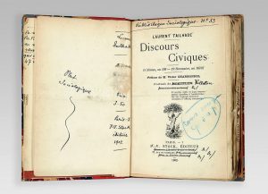 TAILHADE (Laurent). Discours civiques (4 Nivôse, an 109 - 19 Brumaire, an 110). Préface de M. Victor Charbonnel. Paris, P.-V. Stock, 1902. In-12, bradel demi-percaline rouge, dos lisse orné d’un fleuron doré, pièce de titre brune, non rogné,...