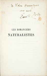 ZOLA (Émile). Les Romanciers naturalistes. Paris, G. Charpentier, 1881. In-12, bradel demi-percaline terre de Sienne, dos lisse orné d’un fleuron doré, pièce de titre bleue, non rogné, couverture (Reliure de l’époque).
