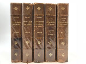 BOISSON (Marius) - Anthologie universelle des Baisers – Asie – Europe – France – Afrique – Amérique et Océanie. 5 vol. in-8 reliés ½ basane, dos à nerfs fleuronné. Paris Daragon 1911-1912. Quelques mors fendillés, quelques coiffes...