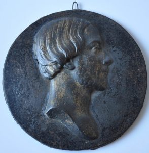 MEDAILLON en fonte, représentant le Comte de Chambord âgé d'environ 30 ans. Gayrard sculpteur. Diamètre 175 mm. (restauration, petit défaut à l'arrière de la tête).