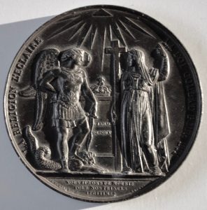 : « HENRI IV, LOUIS XVI, LOUIS XVII, M.ANTOINETTE, M.ELISABETH, LA H. DE R.CONDÉ Duc D'ENGHEIN ». Le tombeau est surmonté d'une urne tenue par la femme et y est inscrit « C.F.DUC DE BERRY XIV FEV 1820 » ; au revers « LA RELIGION L'ÉCLAIRE LA FOI COMBAT POUR LUI – NOUS JURONS DE MOURIR POUR NOS PRINCES LÉGITIMES ». Gravure représentant l'Archange Saint Michel terrassant le dragon, devant un tombeau surmonté de la couronne royale. Il y est inscrit la mention « À JAMAIS DEBOUT ». A droite du tombeau, une femme tient une croix. L'ensemble est surmonté de rayons du soleil.
