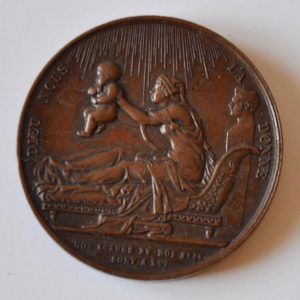 [DUC DE BORDEAUX] MÉDAILLE commémorant la naissance du Duc de Bordeaux. A l'avers, la Duchesse de Berry assise sur un lit dont le dossier est orné du buste du Duc de Berry qui tient dans ses bras un bébé. Sur le pourtour : « DIEU NOUS L'A...