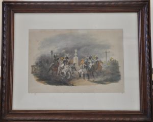 CAVALIERS DE L'EMPIRE autour d'un monument à la mémoire de la Duchesse de Berry. Gravure en couleurs sans mention. Rousseurs infimes. Encadré 360x290 mm.