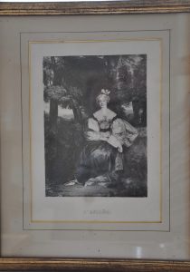 L'EXILÉE [La Duchesse de Berry] assise dans un cadre champêtre. Encadré 320x260 mm.