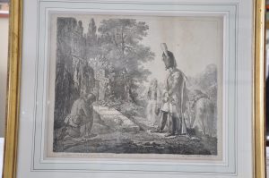 droite, un paysan et au premier plan, un soldant s'inclinant, son cheval derrière lui.