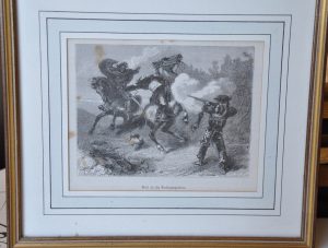 « MORT DE LA ROCHEJAQUELEIN » par A.-F. Rogerie & Ferdinandus del. Gravure encadrée 213x243 mm. Quelques rousseurs.