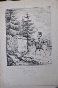 « A LA MÉMOIRE D'HENRY DE LA ROCHE JAQUELIN ». Un soldat à cheval salue le tombeau gravé d'un H sur lequel est inscrit « DIEU ET LE ROI – SI J'AVANCE SUIVEZ MOI. SI JE RECULE TUEZ MOI. SI JE MEURS VENGEZ MOI ». Litho de C. de Liast. Non...