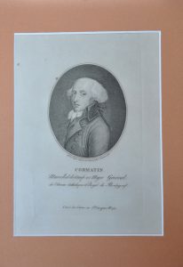 « CORMATIN Maréchal Général de l'Armée Catholique et Royal [sic] de Bretagne » dessiné d'après nature au tribunal par F. Bonneville. A Paris chez l'auteur. Gravure en médaillon non encadrée 300x240 mm. Rousseurs infimes.