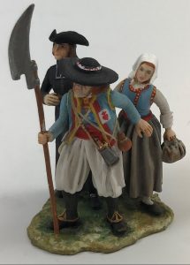 ENSEMBLE DE 3 PERSONNAGES – un combattant, une fermière et un abbé. DIORAMA. Figurines de plomb, fabriquées par l'atelier VANOT et peintes par Louise LEMOINE, artiste de Rennes.