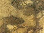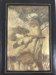 d’un filet doré, figurant deux grands pins dont un en partie couché, qui dominent une futaie éclairée par les rayons du soleil levant.