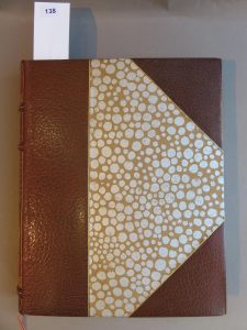 1 volume in-4°, reliure en demi-maroquin à coins chocolat, dos mosaïqué, tête dorée. Reliure signée Yseux. Dos légèrement insolé. Ouvrage tiré à 291 ex., celui-ci sur vélin d’Arches (troisième papier) porte le n° 58. Il comporte une suite en noir des gravures avec remarques. Quelques rousseurs éparses. Ex-libris de Ginette et Marcel Lavergne. Très belles pointes-sèches couleur de Charles Martin.
