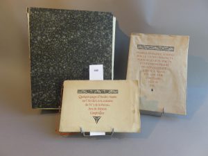 La première en format in-8°, intitulée : Quelques pages d’André Suarès sur l’art du livre, extraites du n° 3 de la revue Arts & Métiers Graphiques. Paris, 1928. Tirées à 37 exemplaires, ces 16 feuillets composant 5 cahiers, reliés par une ficelle orange porte le n° 20 imprimés sur Vergé. Bon état quelques petites traces d’eau et poussière sur la couverture.