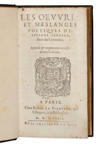 ETIENNE JODELLE (1532-1573) Les œuvres et meslanges poetiques… Reveues & augmentées en cette dernière édition. A Paris, chez Robert Le Fizelier 1583. In-12 (135 x 75 mm).