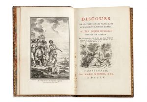 JEAN-JACQUES ROUSSEAU (1712-1778). Discours sur l’origine et les fondemens de l’inégalité parmi les hommes. Amsterdam, Marc Michel Rey, 1755. In-8 (194 x 125 mm).