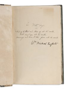 Édition originale enrichie d’un envoi autographe signé de Michael Rossetti (dédicataire de l’ouvrage et frère du poète) à l’encre noire sur le second feuillet de garde :