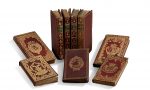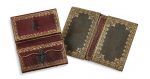 UN CARNET DE BAL en forme de livre, maroquin rouge orné. Médaillon vert central orné. Tirette laissant apparaitre une glace. Armes : La ROCHEFOUCAULD (N...de Villeneuve, dame de) OHR pl. 655.