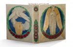 Vélin ivoire, peinture vernissée sur les plats et le dos, sur le premier plat grand ange peint aux ailes d’or dans une couronne de fleurs rouges, et sur le second plat, un vase d’or avec deux colombes, doublures ornées d’un même bouquet de fleurs, gardes de soie moirée blanche, couverture et dos.