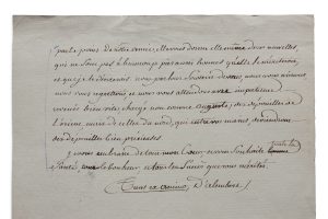 Il parle enfin de Julie de LESPINASSE, dont la santé n’est pas très bonne : « Nous parlons souvent de vous, nous vous aimons, nous vous regrettons, & nous vous attendons avec impatience. Revenez bien vite, chargé, non comme Auguste, des depouilles de l’orient, mais de celles du nord, qui entre vos mains, deviendront des dépouilles bien prétieuses »…