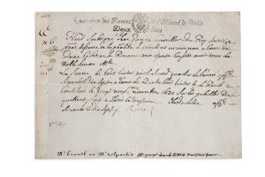 « Nous soubsigné Jean Racyne Conseiller du Roy tresorier g[e]n[er]al de France en la g[e]n[er]alité de Moulins en mon nom a cause de Dame Catherine de Romanet mon espouse confesse avoir tenu de noble homme Mr [le nom est resté en blanc] la somme de cent livres pour le second quartier de l’année MLIC soixante dix sept a cause de quatre cent livres t[ournoi]s de Rente constituée le vingt neufme novembre 1630 sur les gabelles »…