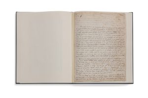 déchirures à 2 lettres par bris du cachet), chaque lettre montée sur onglet sur des feuillets de papier vélin fort, le tout relié en un volume in-4 (26 x 21 cm), plats souples en huit lames articulées de bois d’acajou, bordés en gouttière d’une baguette d’ébène, pièces d’attaches trapézoïdales en galuchat noir, appuyées en tête et queue sur une pièce polygonale d’ébène bouchardée, couture sur deux nerfs noirs, dos requin noir, doublures de nubuck châtaigne, gardes de papier noir (signé J. de Gonet 2002).