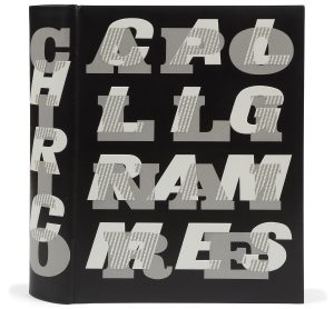 Box noir, premier plat comprenant sur quatre lignes le nom de l’auteur en lettres capitales droites mosaïquées en box gris, avec le titre de l’ouvrage en superposition inscrit en lettres capitales italiques mosaïquées en box blanc ; on trouve la même composition sur le second plat mais le titre est en lettres capitales droites mosaïquées en box gris et le nom de l’auteur en lettres capitales italiques mosaïquées en box blanc ; dos lisse portant le nom de l’illustrateur en capitales alternant une lettre droite en box gris et une lettre en italique de box blanc, doublures et gardes de daim gris, tranches dorées sur témoins, couverture et dos conservés, chemise à dos et bandes à recouvrement de box noir, le dos étant orné du titre en lettres mosaïquées de box gris et du nom de l’auteur et de l’illustrateur en lettres au palladium, étui (Leroux, 1988).