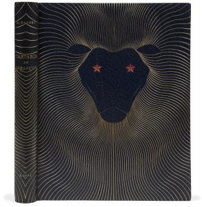 Maroquin bleu nuit, plats ornés d’un décor de filets dorés irradiants débordant sur le dos, partant d’une silhouette d’une tête de lion dont les contours sont dessinés à froid, les yeux étant formés d’une pastille de box rouge surmontée d’une étoile dorée ; dos lisse, doublures et gardes de daim rouge bordé d’un listel de maroquin gris, tranches dorées sur témoins, couverture et dos conservés, chemise à dos et bandes à recouvrement de maroquin bleu, étui (Paul Bonet, 1949).