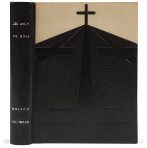 Maroquin noir, croix de maroquin noir sur fond de maroquin beige sur la partie supérieure des plats, projetant une ombre trois fois répétée, celle au centre descendant jusque sur le bord inférieur des plats, dos lisse portant le titre et le nom de l’auteur en lettres au palladium ; large cadre de maroquin beige et noir à l’intérieur, avec rappel du décor des plats, doublures et gardes de daim blanc, doubles gardes, non rogné, couverture et dos conservés, chemise, étui (Pierre Legrain).