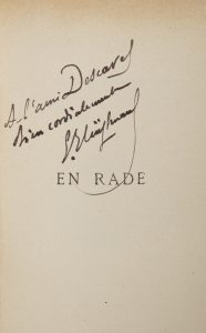 En regard du titre figure une note autographe de Lucien Descaves à côté d’une petite coupure de journal faisant état de la vente pour 6 000 frs du manuscrit de En rade ; Descaves donne l’identité du vendeur qui est le docteur Fleury « à qui Huysmans l’avait donné ».