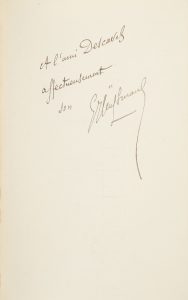 ► Précieux exemplaire que Descaves a truffé d’une page autographe de Huysmans proposant un fragment inséré dans une article de L’Écho de Paris du 26 septembre 1901 sur le départ des moines de Ligugé, d’une table des matières d’une page et demi in-18 également de la main de Huysmans, ainsi que de 2 articles de l’auteur ne figurant dans aucun de ses recueils.