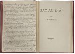 L’exemplaire appartint par la suite au journaliste, bibliographe et bibliophile Pierre Dauze (1852-1913), qui l’acquit à la librairie Gaillandre. On trouve reliée à la fin une lettre autographe signée de Huysmans qui lui fut adressée le 2 mai 1898, dans laquelle l’auteur apporte ces précieuses informations : « Vous me demandez quelques renseignements sur une plaquette de Sac au dos que vous avez acheté chez Gaillandre. C’est fort simple, cette plaquette tirée en tout à 10 exemplaires sur chine est la première version de Sac au dos tel qu’il parut dans l’Artiste, à Bruxelles.