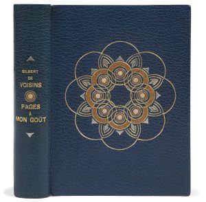 Maroquin bleu, plats ornés d’une grande rosace centrale, composée de cercles dorés et mosaïqués de maroquin havane, marron et beige, bordés tout autour de filets dorés courbes ainsi que de losanges et de triangles au palladium ; dos lisse orné du nom de l’auteur et du titre dorés, séparés par un motif circulaire doré et mosaïqué et bordés de deux triangles au palladium ; encadrement de maroquin bleu orné d’un filet, de pointillés et de triangles dorés, doublures et gardes de soie moirée bleue, doubles gardes, tranches dorées sur témoins, couverture et dos conservés, chemise à dos et bandes à recouvrement de maroquin bleu, étui (Franz - Fache, doreur).