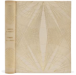 Maroquin blanc, plats ornés d’un décor symétrique composé de filets courbes à froid symbolisant des nuages, et de dizaines de filets dorés rayonnant s’entrecroisant au centre, les filets débordant sur le dos lisse formant deux compartiments de losanges dorés entourant le nom de l’auteur et le titre, doublures et gardes de maroquin blanc, tranches dorées sur témoins, couverture et dos conservés, chemise à dos et bandes à recouvrement de maroquin blanc, le dos étant décoré comme celui de la reliure, étui (Semet & Plumelle).