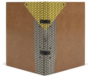 Reliure à nerfs apparents, composée de deux pièces de cuir à motifs de faux tressé, l’une jaune sur le haut du dos disposée en pointe débordant sur les plats, l’autre grise couvrant le reste du dos et une petite partie des plats ; plats de médium verni satiné brun, petits cabochons noirs ; doublures en nubuck jaune, non rogné, couverture et dos conservés, chemise à dos plat de box gris, doublée de nubuck jaune, étui (J. de Gonet, 2006).