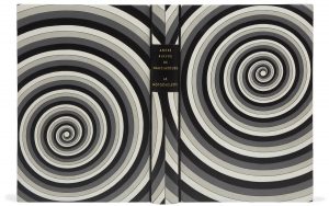 Reliure en box, entièrement décorée sur les plats d’une grande spirale faite alternativement de bandes de box noir, blanc, gris, et gris bleu, plusieurs fois répétées, chaque spirale débordant sur une moitié du dos ; dos lisse, doublures bords à bords et gardes de box gris, tranches dorées sur témoins, couverture et dos conservés, chemise à dos et bandes à recouvrement de box noir, étui (P.L. Martin, 1966).