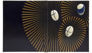 plat décoré de 3 demi-œufs en plexiglas, peints à l’acrylique bleu, desquels rayonnent des bandes de papier photographique dans les tons ocre et bleu, débordants sur le dos et la moitié du second plat, dos lisse portant le nom de l’artiste en grandes capitales à froid disposées à la chinoise, non rogné, couverture et dos conservés, emboîtage de toile ocre portant au dos une bande de box violet sur laquelle ont été dorés les noms de l’auteur et de l’artiste (Mercher 1973).