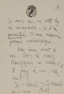 [Ces deux lettres datent de la maturité de Gabriele d’Annunzio. Il vivait alors sur le lac de Garde dans sa villa du Vittoriale. Ayant dépassé la soixantaine, ce séducteur impénitent avait conquis en 1923 la jeune Française Angèle LAGER, née en 1901, qui était au service de Marguerite d’Espaigne, une dame d’âge mur, cultivée, qui possédait également une villa au bord du lac, Il Rimbalzello. Pris de passion, il obtint de Mme d’Espaigne de se faire aménager un petit appartement dans sa villa afin de rejoindre plus aisément la jeune femme. Lorsque Mme d’Espaigne retourna en France, Gabriele d’Annunzio installa Angèle chez lui ; mais cette présence éveilla la jalousie de Luisa Baccara, gouvernante et maîtresse de l’écrivain, qui finit par la renvoyer en 1925. Ces lettres datent du début de leur liaison, quand, après avoir passé la nuit dans la villa de son amant, Adèle repart dans celle de Mme d’Espaigne. Le poète les signe du pseudonyme d’Ariel, d’après l’esprit enchanteur dans La Tempête de Shakespeare.]
