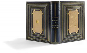 maroquin ivoire rectangulaire mosaïquée, sur laquelle mordent six triangles dorés, portant le titre doré au plat sup., et un carré doré au plat inf. ; doublures de maroquin ivoire décoré d’un semis de F et de points dorés et sur le bord intérieur d’un liseré de maroquin rouge formant, avec les charnières intérieures en maroquin bleu, les couleurs du drapeau français ; gardes de soie blanche brodée de fils d’argent ; doubles gardes de papier moucheté à l’or ; dos lisse orné de filets dorés, étui (Pierre Legrain, J. Anthoine Legrain).