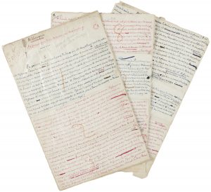 Le manuscrit est écrit alternativement à l’encre bleue et rouge. Il présente quelques ratures et corrections. Les feuillets ont été remontés en désordre, mais le manuscrit est bien complet.