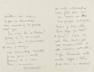 « Même ici je suis averti de la campagne énorme que vous faites en ma faveur. Vous ajoutez si possible à ma confusion… De plus en plus il faut que je convienne que votre intervention aura fait plus pour son succès que 600 pages indigestes. Comme je dois être haï déjà par tant de gens ! – C’est le côté bien triste, par moi irréparable, de cette soudaine notoriété. Enfin heureusement votre amitié suffit à tout. Je me sens un vieillard pénible à vos côtés – Le jour des barricades vous monterez le premier tant pis. Que vous dire de Berlin ? Prenez 1/3 de ce qui s’écrit dans les journaux et vous y serez »…