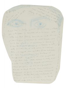 La lettre est découpée en forme de visage, dont la bouche, le nez, les yeux (les pupilles en forme de cœur), les cheveux, sont dessinés au crayon bleu.