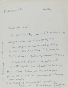 OCTEAU Jean (1889-1963). L.A.S. « Jean Cocteau », Milly 1er novembre 1962, [à Henry de MONTHERLANT] ; 1 page in-4.