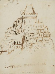 HUGO Victor (1802-1885). DESSIN original avec légende autographe, Souvenir d’Apreville ; encre brune, plume et lavis, 25 x 19,5 cm, encadrement sous verre.